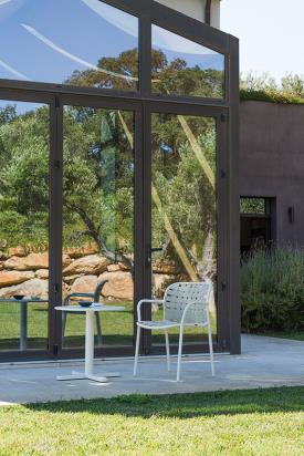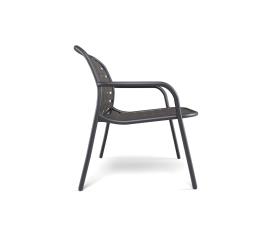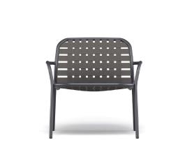 Emu Réf. 503 - Design. Stefan Diez Dimensions : l 78,5 x h 75 x p 69 cm Les sangles élastiques tressées, fixées de manière innovante à la structure en aluminium sophistiquée, donnent vie à une collection au style éclectique et exceptionnel, offrant un confort optimal et parfaitement adaptée à une utilisation en extérieur. La collection Yard se pare de nouvelles sangles 100 % acryliques, dont 50 % de fibres recyclées, garantissant ainsi la longévité et la durabilité du produit. Elle est disponible dans une nouvelle gamme de couleurs et le système de fixation des sangles tressées à la structure légère en aluminium a été conçu en harmonie avec l'esthétique du produit. Matériel: Aluminium - Sangle chauffeuse
