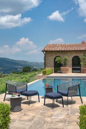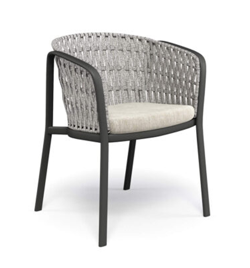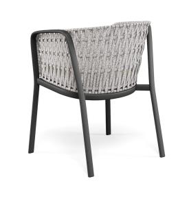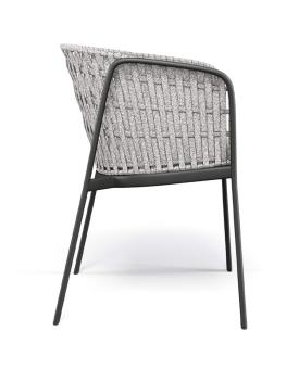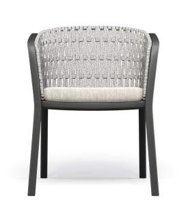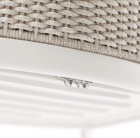La structure en chevalet est en tubulaire d’aluminium. Constituée d’une tôle en alliage d’aluminium, dont la forme pure est obtenue par emboutissage, l’assise est ensuite fixée à la structure d’aluminium par une soudure structurelle relevant de la technologie TIG, qui assure à la fois une résistance élevée et un meilleur standard esthétique. La structure du dossier, réalisée en acier, est le support sur lequel sont réalisés les tressages décoratifs dans les différentes matières proposées. Tous les matériaux sélectionnés garantissent un bon niveau de résistance et la stabilité du coloris. Les poufs ont une structure tubulaire ovale en aluminium, tandis que les tables ont une structure en ronds d'acier avec une surface en alliage d'aluminium et des semelles intérieures réglables en nylon et vis en acier inoxydable. Le tout décoré de tissage de corde.