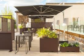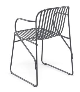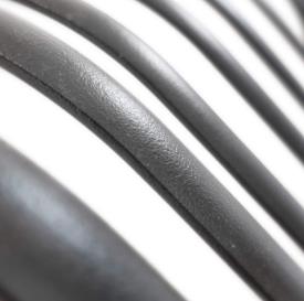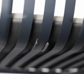 La structure, entièrement soudée, est réalisée en tubulaire et barres à profil arrondi (en demi-amande) d’acier Fe360. Revêtement en Emu-Coat (cataphorèse + laquage).